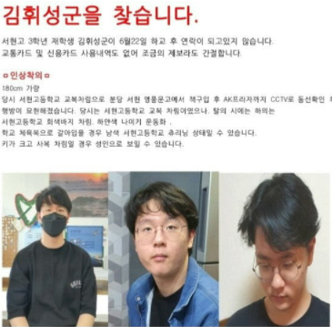 당일 서점에 들렀다가 집에 가겠다는 연락을 마지막으로 집에 돌아오지 않자, 김군의 부모님들이 바로 실종 신고를 했다고 합니다. 경찰은 집 인근과 마지막 장소 주변을 수색했지만 김휘성 군은 발견되지 않았습니다. 가출에 대한 의심 정황도 없었기에 더 걱정이 되기도 했습니다.