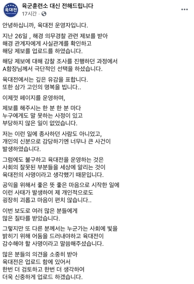함장 사망 사건과 관련해 해당 사건을 처음 언급했던 육군훈련소 대신 전해드립니다 페이스북 운영자가 괴로운 심정을 표현했습니다. 관리자는 26일 함장 아들 인사 논란 관련 제보를 받아 사실관계를 확인하고 내용을 올렸다고 합니다. 하지만 조사 과정에서 함장 극단 선택이 발생하여 깊은 유감을 표하며 고인의 명복을 빈다고 밝혔습니다.