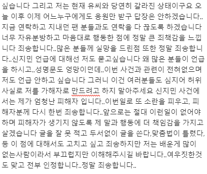 계속되는 논란에 결국 권민아는 5일 자신의 인스타그램을 통해 모든 사실을 인정했습니다. 권민아 사과 내용을 보면 유준영이 양다리를 걸친것이 맞다고 인정하고 있습니다. 자신이 꼬리를 쳤고, 여우짓을 한 것은 모두 맞으며, 모든 내용을 인정하고 앞으로 SNS를 당분간 하지 않겠다고 밝히기도 했습니다.