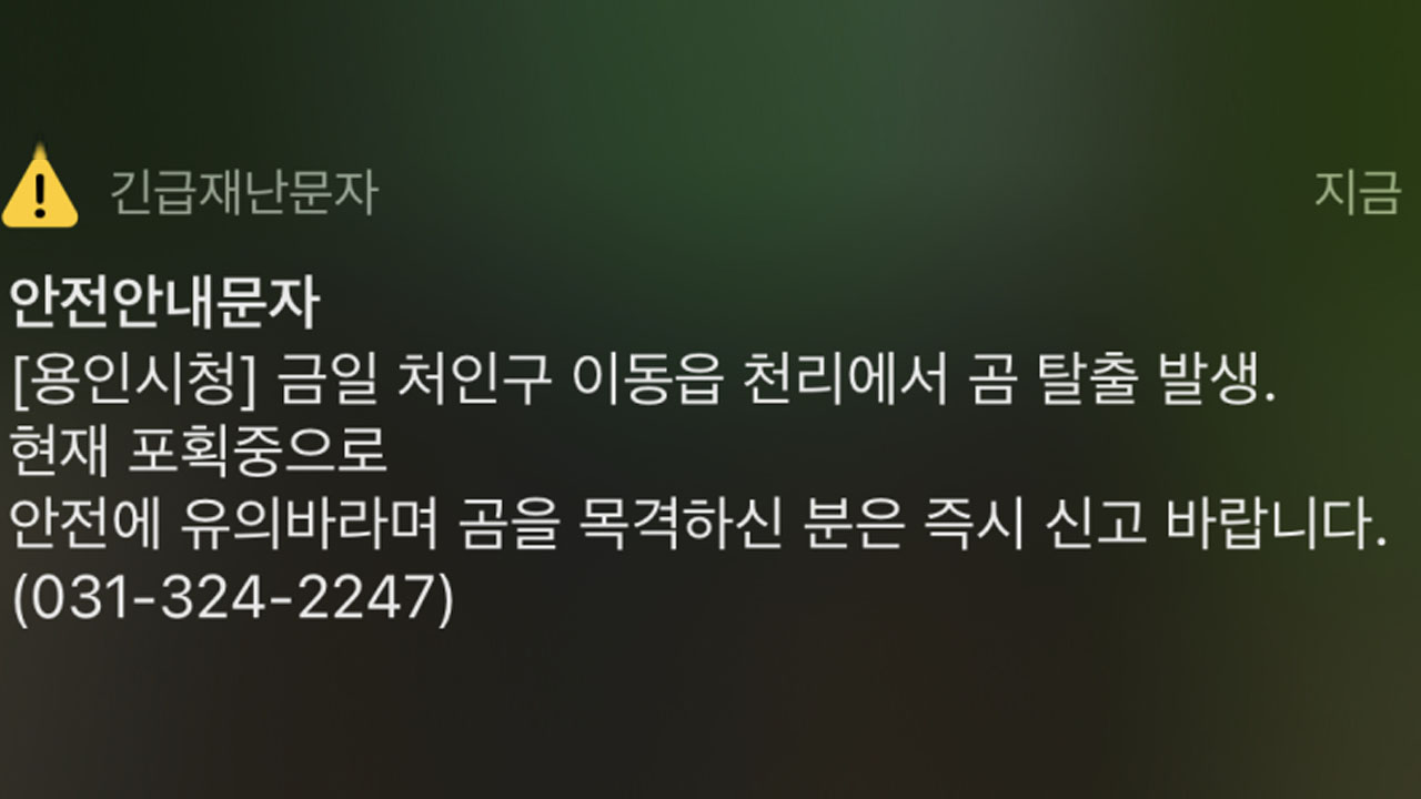 6일(화) 오전 10시 30분쯤 용인시 처인구 이동읍에 있는 용인 곰 사육장에서 반달가슴곰 2마리가 탈출했다고 합니다. 시는 안전 문자를 보내며 인근 곰 사용장에서 곰이 탈출한 상태임을 알렸습니다. 안전 문자 내용은 곰이 탈출했으며, 현재 포획중이라고 밝히며 곰을 목격한 경우 신고하라고 안내하고 있습니다.