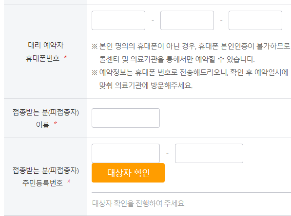 가족이나 다른 대리인이 예약을 할 경우에는 대리인(신청인) 명의의 휴대폰이나 공동인증서가 필요합니다.