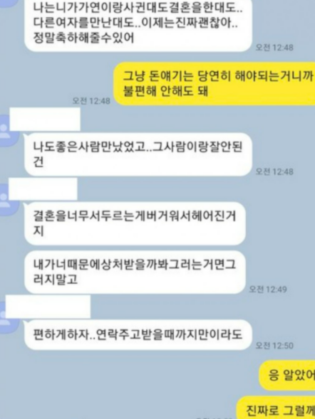 하지만 이후 둘의 카톡 내용을 공개하면서 전 연인이 아무렇지 않게 카톡을 하며 일상 안부를 묻거나 부탁을 하는 내용으로 자신을 용서했다고 생각하고 현재의 여친과 사귀고 결혼을 하게 되는 것이라고 밝히고 있습니다.