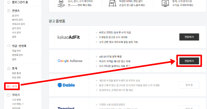 수익 항목으로 들어가면 구글 애드센스 연동하기가 나옵니다. 본인의 애드센스 메일주소를 입력하고 연동을 해줍니다. 이후 애드센스로 가서 재신청을 하면 '애드센스에 연결하기 위해서는 Tistory상에서 셋업이 제대로 되어 있는지 다시 확인해 주세요' 문제가 말끔히 해결됩니다.