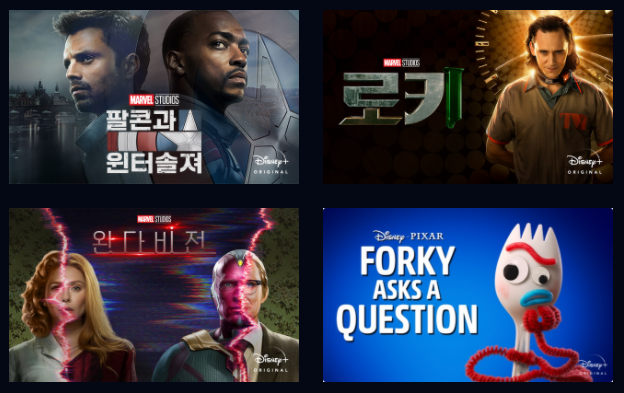 디즈니플러스에는 픽사나 디즈니 고유 콘텐츠, 마블, 스타워즈, 내셔널지오그래픽, 오리지널 콘텐츠로 이루어져 있습니다. 이미 넷플릭스나 쿠팡플레이, 시즌, 티빙 등에서 관련 콘텐츠들의 제휴가 끝나 빠진 작품들이 많으며, 디즈니를 좋아하는 분들이 많기 때문에 가입자는 많을 것으로 예상됩니다.