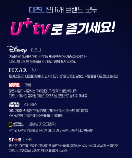아울러 디즈니 플러스 가입방법에 팁을 하나 드리자면 국내 이동통신사들 중 LGU+과 KT가 디즈니플러스와 제휴계약을 맺은 상태라고 합니다. 따라서 유무선 상품을 이용할 경우 제휴 방식을 통해 디즈니 플러스 요금제 할인 혜택 등을 받을 수 있으니 함께 비교해보시기 바랍니다.