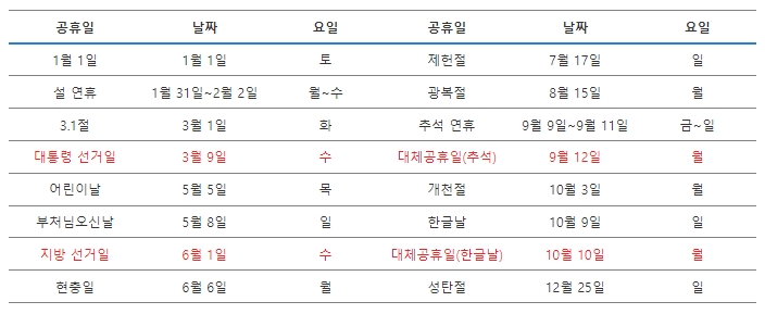또한 3월 9일(수)은 대통령 선거일이 있고, 6월 1일(수)은 지방 선거일이 있습니다.